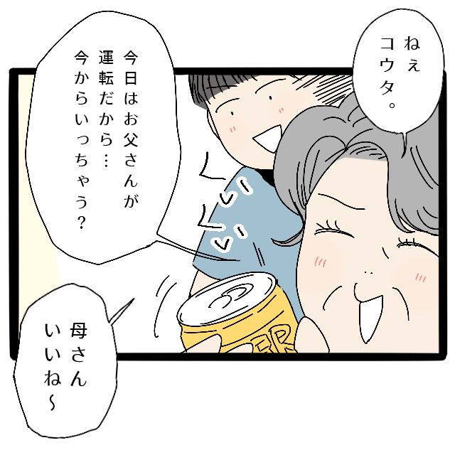 旅行中はアオちゃんのお世話のサポートをすると何度も言っていたコウタさんでしたが、義母に勧められるままに嬉しそうにビールを飲み始めてしまいました。