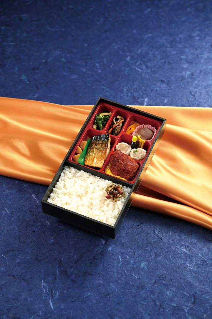 この記念弁当は、福井県産のブランド米「いちほまれ」を主食に、さばの醤油干しやボルガライス風チキンカツなど、福井県の名産品を使用したおかずを豊富に詰め合わせたものです。福井銘菓の羽二重あんころ餅や、崎陽軒の昔ながらのシウマイ2個も一緒に入っていますよ。