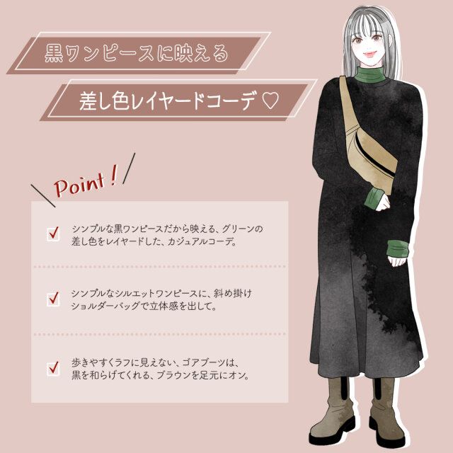 黒ワンピースに映える、差し色レイヤードコーデ