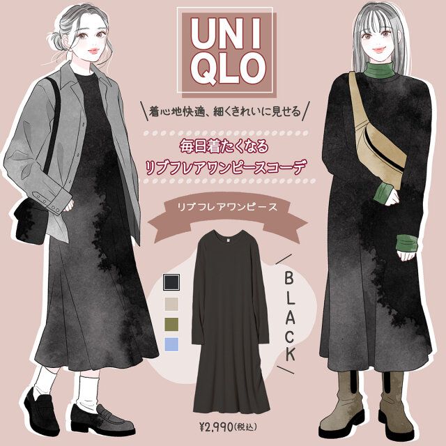 イラストレーターのAKIKO。です。今年もユニクロから上半身と袖部分はスリムに、スカートはボリューム感を持たせたフレアシルエットの「リブフレアワンピース」が登場しました。シルエットも着心地も快適◎デイリーユースしたくなる、トレンドを取り入れたコーデを2つご紹介します。