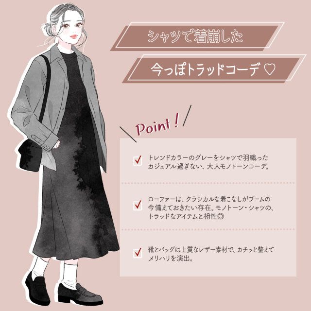 1つ目は、女性らしいシルエットのワンピースに、グレーのシャツを羽織ることで、トラッドなムードが漂うきれいめコーデを演出。足元はスニーカーではなく、あえてローファーを合わせた高見えカジュアルコーデになります。