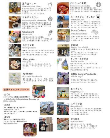 当日はパフォーマンスイベントも開催。「ネイティブによる英語の絵本読み聞かせ」(午前11時~)、歌やダンスをしながら真っ白な布に絵の具をつけて遊べる「子ども参画型~音と色で遊ぼう~」(午後1時~)、鍵盤ハーモニカ奏者のあやちんさんやハンマーダルシマー奏者のMiekoさんによる演奏(午後2時~)など、子どもと一緒に楽しめるイベントです。