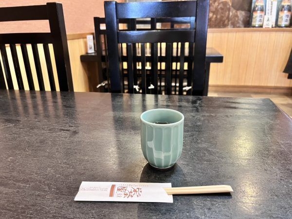 今回私はテーブル席に案内していただきました。温かいそば茶をいただきながら待ちます。