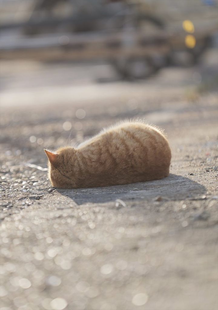暖かそうな日差しのもと、ごろんと横になっている茶トラ猫。 気持ちよくお昼寝中なんでしょう。
