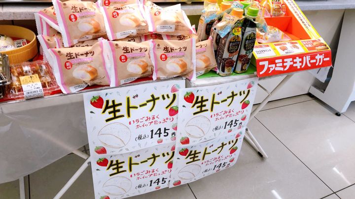 ファミマでも昨年から、カスタードホイップやチョコホイップの生ドーナツを発売してきました。今回はいちごみるくホイップ。値段は変わらず145円(税込)。味わいやいかに!?