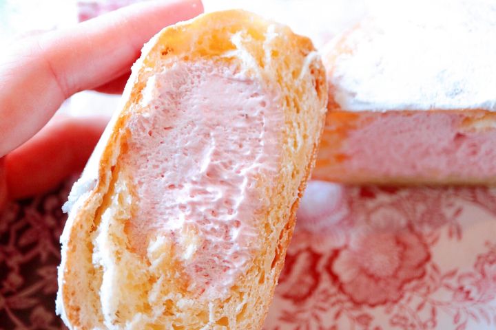半分に割ると、いちごみるくホイップがたっぷり詰まっています。生地に生クリームが練りこまれているので、しっとりとしています。ふわふわのパンのような…。でもとても口溶けが良いのはやはり、生クリームが練りこまれているからでしょうね。揚げられた感じがしないので、生地がドーナツよりも軽くて、どんどん食べられます。