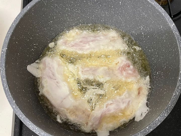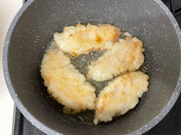 フライパンに高さ1cm程度の油を入れたら中火で熱し、こんがりするまで揚げます。
