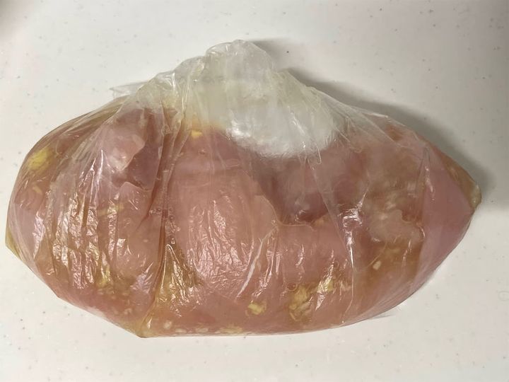 ポリ袋に鶏むね肉、白だし、酒、にんにく、しょうがを入れ、よく揉み込みます。
