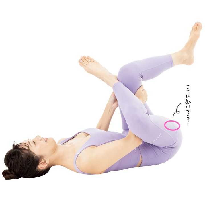 寝転がり、片足にかけるようにして下肉を伸ばす。痛気持ちいい程度に伸びている感覚を意識しましょう。