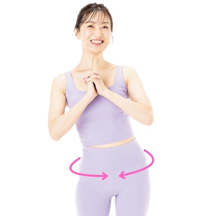 上半身は固定し、軸は真っ直ぐに。腰だけを回すイメージで、ゆっくり丁寧に右回り、左回りと回します。
