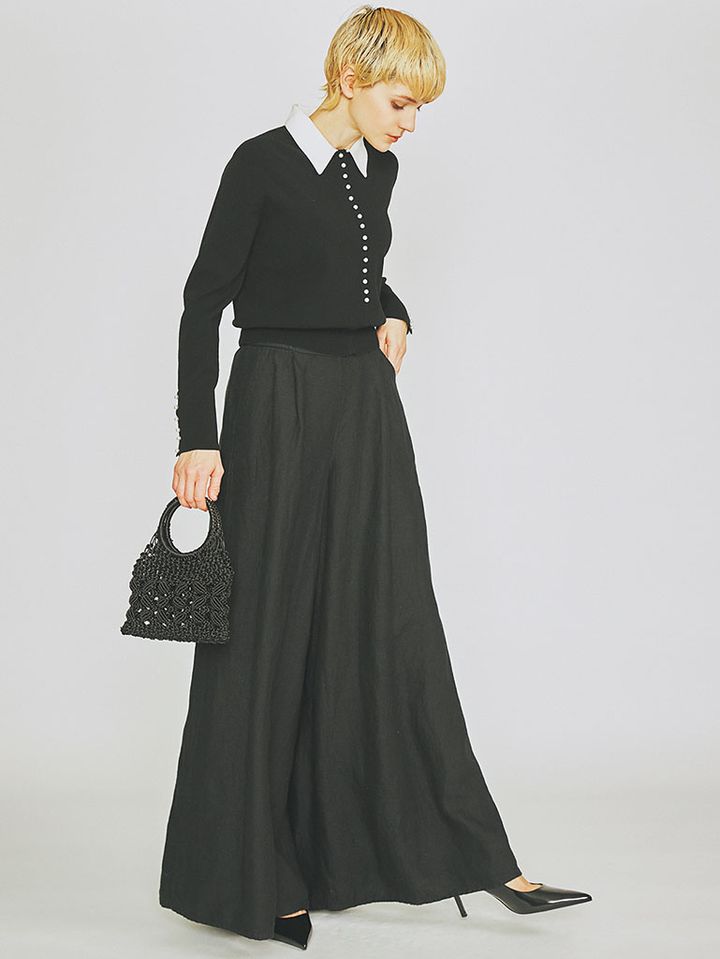 【POINT】フレアスカートのように動きにあわせてなびくダイナミックなワイドパンツ。リネンのさらっとした風合いにより、面積の広い黒でも重厚感なく穿ける。バッグ部分に隠しファスナーがあり、きゅっと締まったハイウエストでも着脱が簡単。