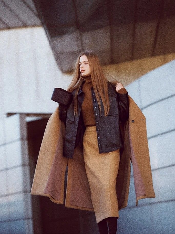 黒レザーシャツ 49,500円/ワン ティースプーン(ジャック・オブ・オール・トレーズ プレスルーム) ブラウンニット 17,600円、肩にかけたコート 49,500円/ともにMIESROHE ベージュスカート 14,300円/THROW by SLY(バロックジャパンリミテッド) ピアス 16,720円/SOKO(ZUTTOHOLIC) 黒バッグ 29,700円/パピルス(アイネックス) 黒ニーハイブーツ 38,500円/TSURU By MARIKO OIKAWA