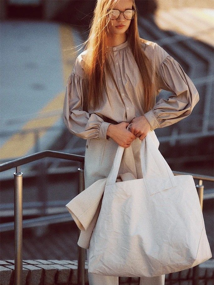 エクリュフェイクレザーシャツ 18,700円/マノン(エムケースクエア) オフ白トラウザーパンツ 39,600円/タンジェント バッグにかけたコート 51,700円/エトレトウキョウ べっ甲眼鏡 22,770円/COACH(ルックスオティカジャパン カスタマーサービス) 生成りビッグキャンバストートバッグ 28,600円/ソリッドアンドストロング バッグ ストア