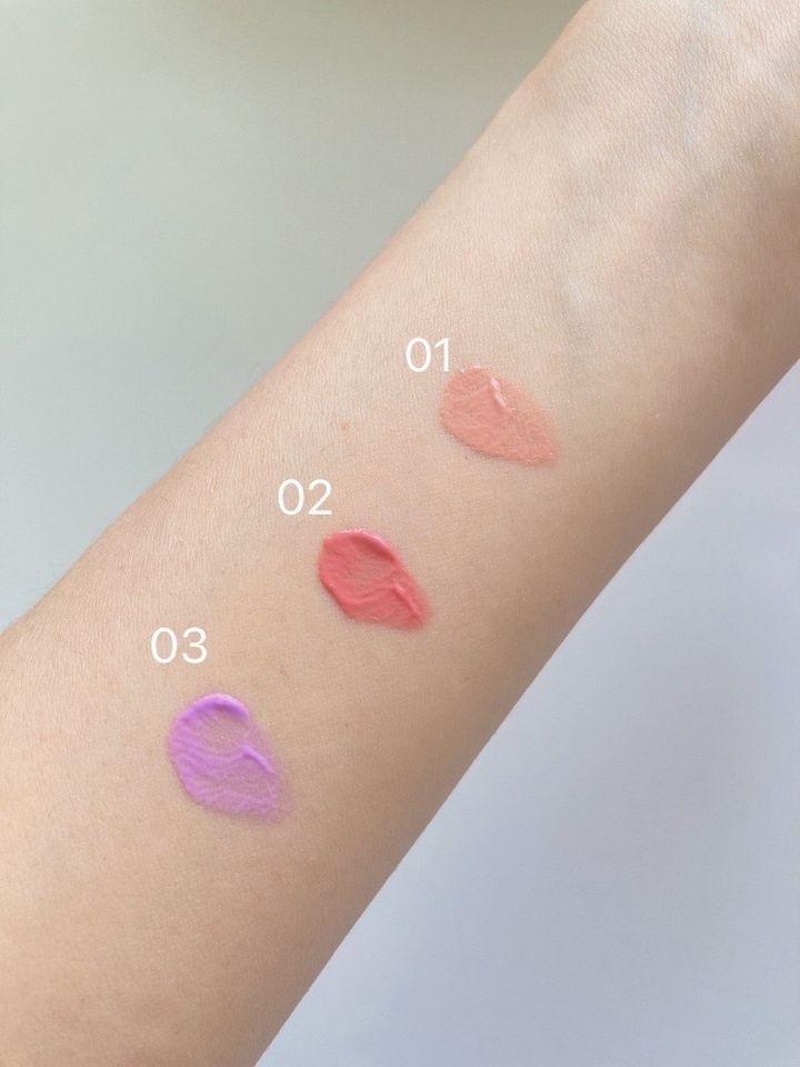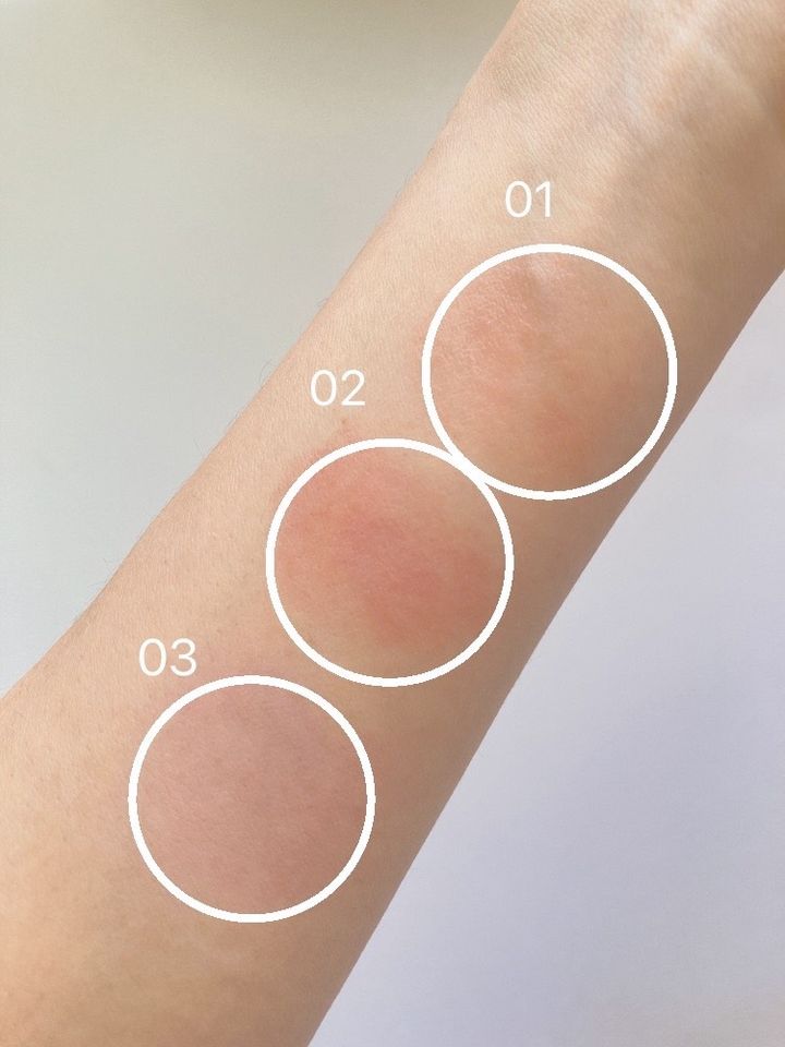 03のトーンアップ感分かりますよね? 編集Kのオススメは03をハイライトのようにのばした上に01を重ねる、です。自然なツヤが出るので、ラメの多いハイライトが苦手な方にオススメです。
