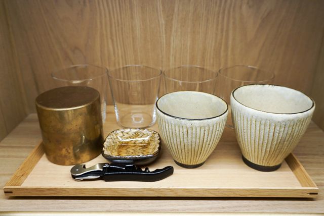 ミニバーも作品で溢れています。湯呑みは額賀章夫さんの笠間焼、お皿は伊藤丈浩さんの益子焼、SyuRoの茶筒。ひとつずつ手にとって、職人の技を感じてみてください。