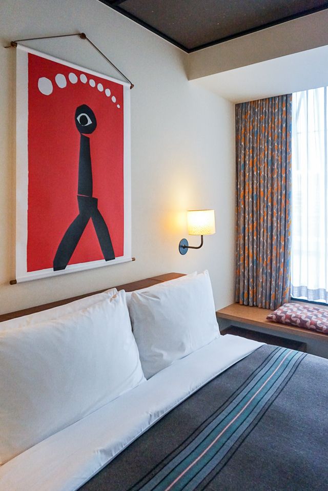 部屋の中心に飾られたタペストリーは、柚木沙弥郎さんの作品です。エースホテル京都では、ホテルのオリジナルロゴや全客室のアートに柚木さんのデザインを採用しています。客室によってデザインが異なるので、扉を開ける瞬間はワクワクしますね。