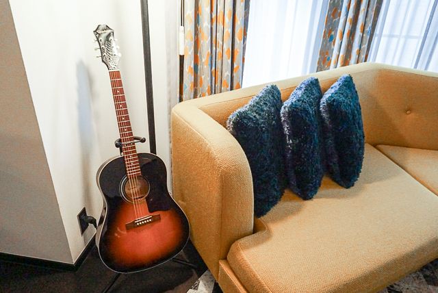 また、一部の客室には「Epiphone」のギターも設置されています。もちろんディスプレイではなく、実際に演奏できるもの。アートと音楽を軸に生まれたホテルだからこそ、彼らの存在感は主役級。旅人たちは、それぞれの部屋でどんな音楽を奏でているのでしょうか。