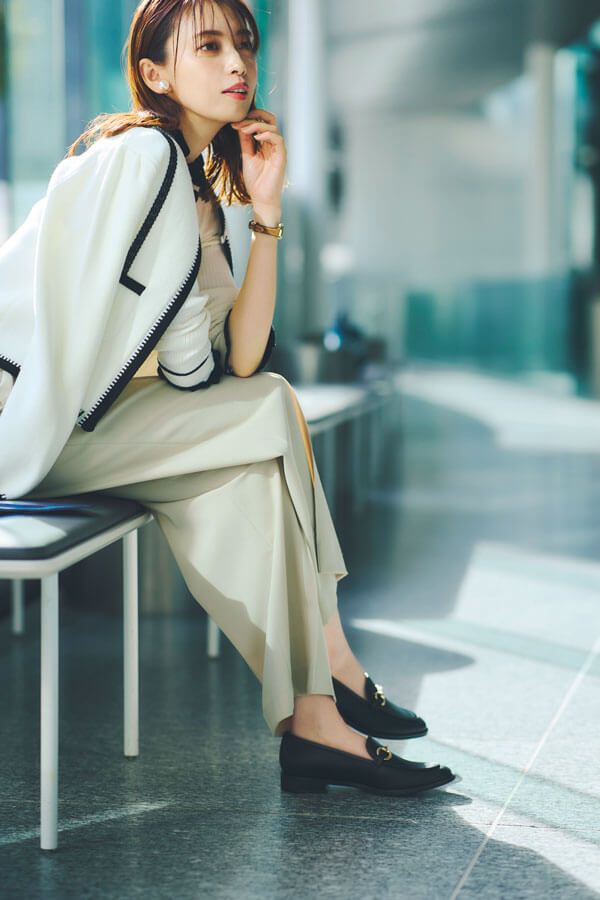 パンツ¥30,800/マルティニーク(マルティニーク ルミネ横浜) カーディガン¥22,000、ニット¥16,500/ともにレッセ・パッセ ベルト¥3,850/RESEXXY バッグ¥15,900/CHARL ES & KEITH 腕時計¥42,900/コーチ(エイチエム スウォッチストア ルミネエスト新宿店) イヤリング¥8,800/masae(ロードス) ローファー¥25,300/銀座かねまつ(銀座かねまつ6丁目本店)