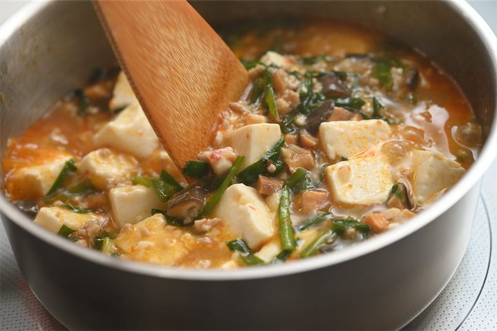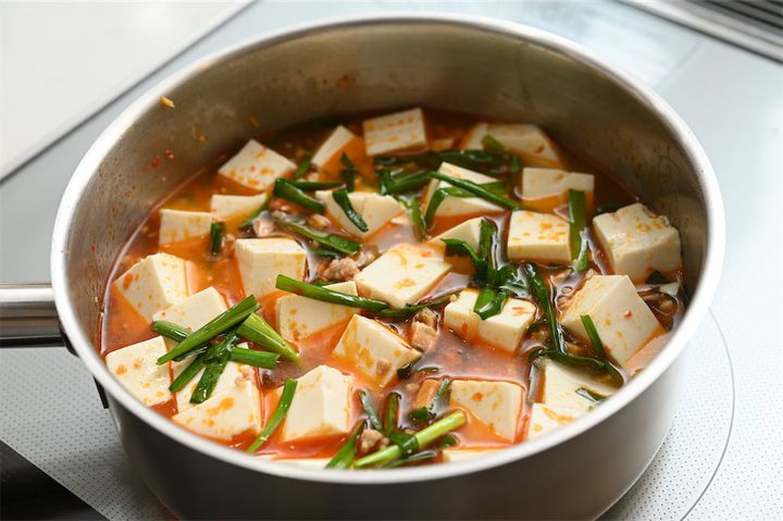 豆腐がクツクツ踊るくらいの火加減がベストです。