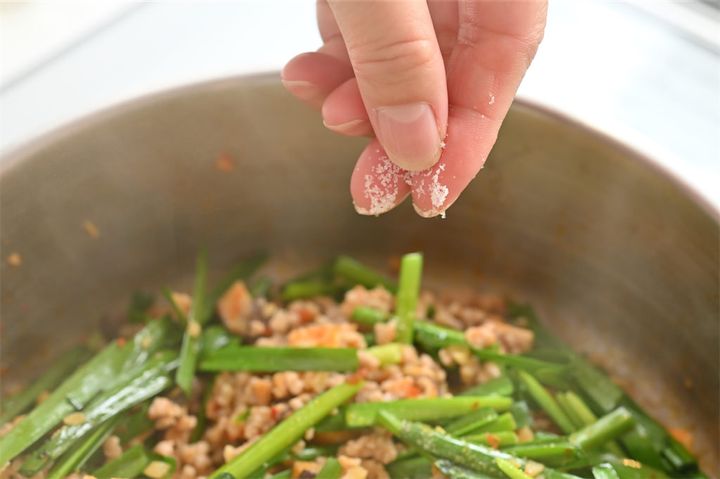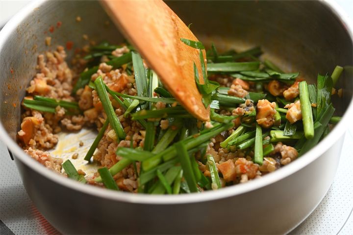 5.豚ひき肉に火が通ったらニラを入れてさっと炒め、塩、こしょうで味をつける。