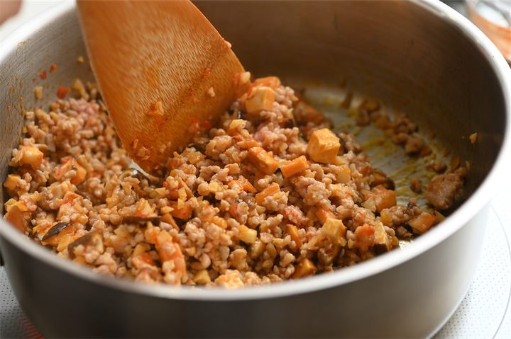 4.3の鍋に1のしいたけを入れ、油が回ったら豚ひき肉を入れて炒める。