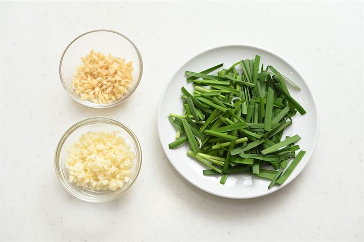 2.にんにくとしょうがはみじん切り、ニラは5cm長さに切る。