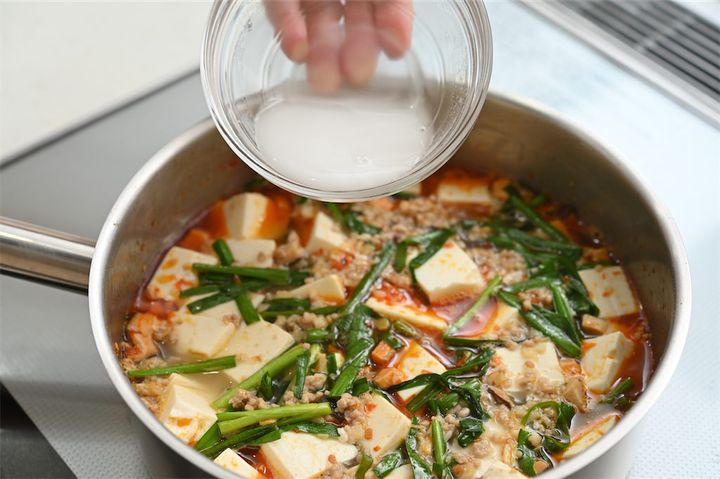 7.片栗粉を小さじ1の水(分量外)で溶き、6に回しかけてとろみをつける。
