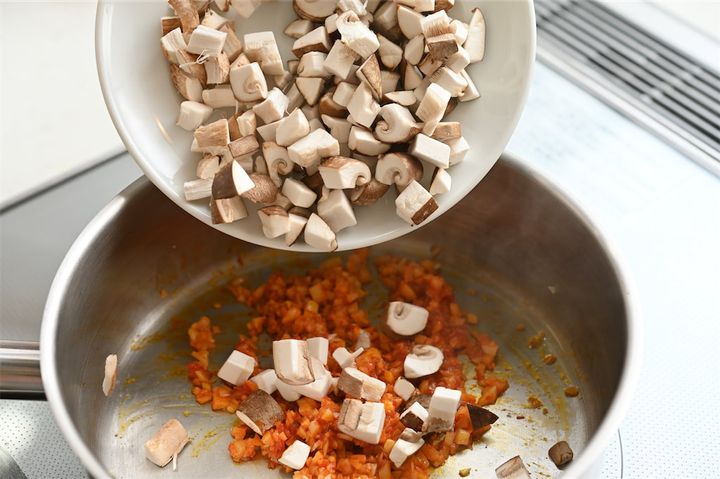 今回、しいたけの軸の旨味がたっぷり出た麻婆豆腐の汁も余すことなく味わうため、汁ごとご飯にかけて、麻婆豆腐丼として作っていきたいと思います。