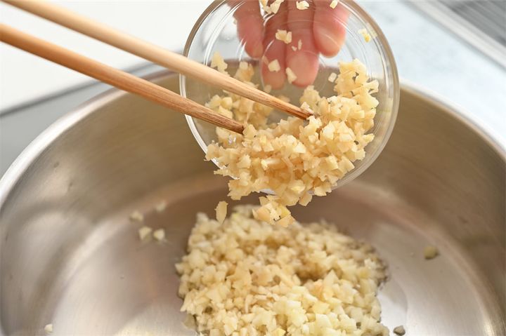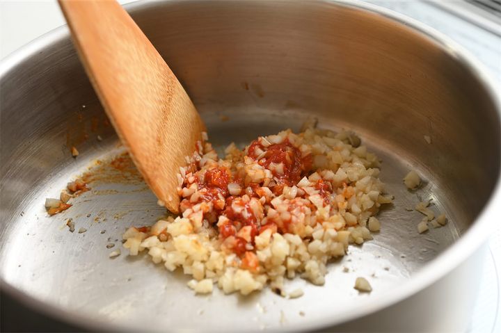 3.鍋にゴマ油を熱し、にんにくとしょうがを炒める。香りが立ったら豆板醤も入れる。