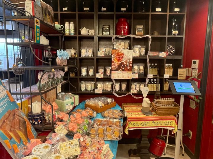 赤い扉を開けると1Fにはケーキや焼き菓子、紅茶がずらりと並んだブティックが。