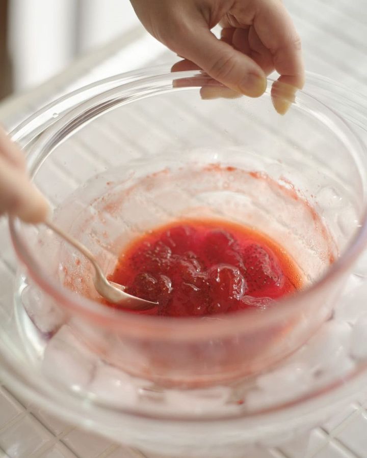 (3)(2)のボールの底を氷水に当て、混ぜながらさまします。これで仕上がりがきれいな色に。粗熱が取れたら清潔なびんに入れて。