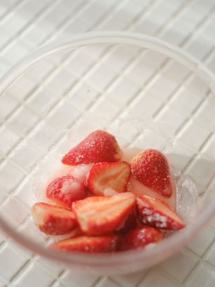 (1)いちごはよく洗ってへたを取り、水けを拭く。縦半分に切って耐熱のボールに入れ、砂糖、レモン汁を加えてあえます。好みでバニラエッセンスを加えると、バニラの風味も加わっていい香りに。10分おいて水分が出てきたら、ラップをかけずに電子レンジ(600W)で4分加熱。