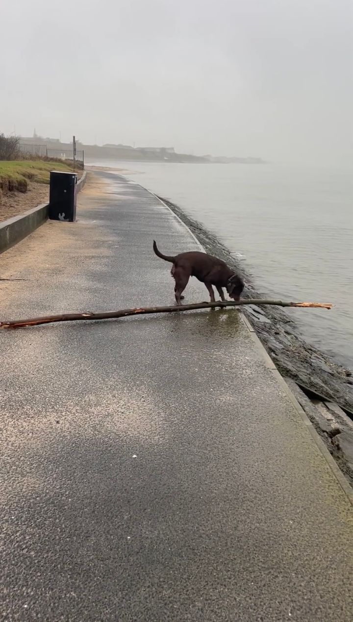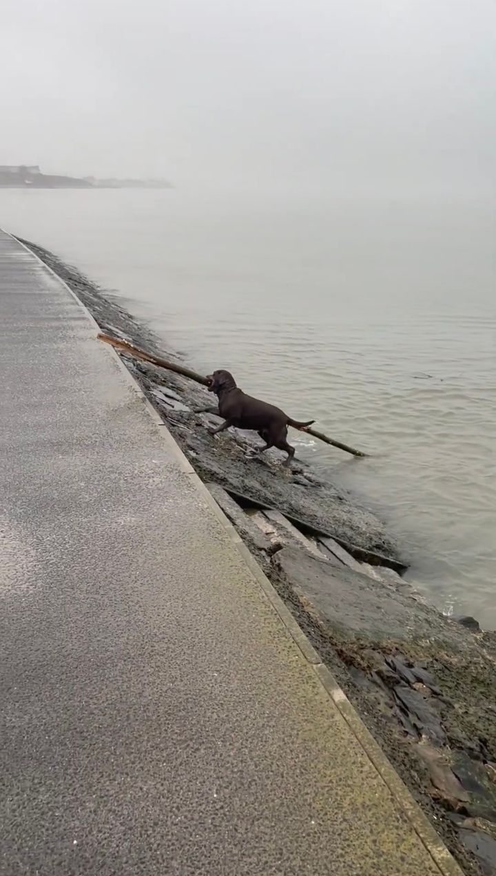 ご機嫌な様子で岸に上がってきた犬。いい枝を見つけたようで喜んでいますが・・、その大きさにビックリ!!【海外・動画】