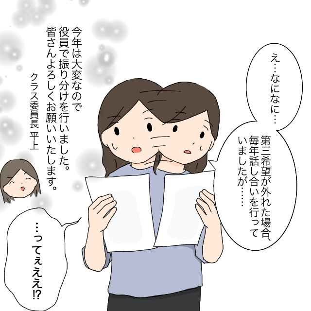 プリントに書かれた係分担表をよく読んでみると、第3希望の中に入れない場合でも今年は話し合いをせず、役員で振り分けを行いました、とあります。