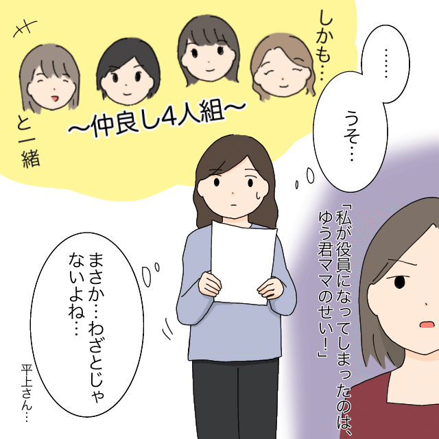 役員決めの日、帰り際に大きな声で「ゆう君ママのせい!」と怒っていた平上さんの顔を思い出しながら、ひかるさんはついそんな風に考えてしまうのでした。