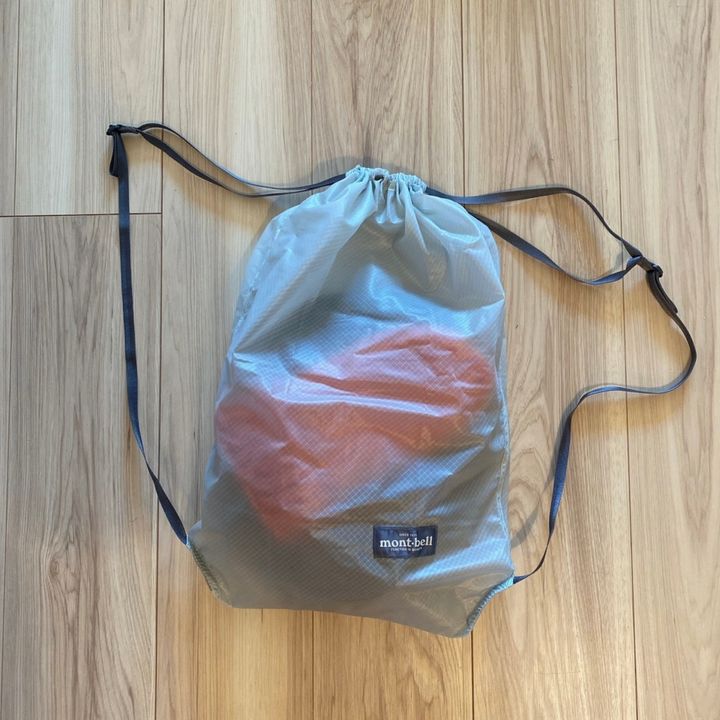 余談ですが、近所にお散歩くらいのときは、このmont-bellのナップサックが超使えます。39gと激軽! ポケッタブル仕様で、持ち歩くのにも◎。グレーのちょっと透ける感じもタイプです。