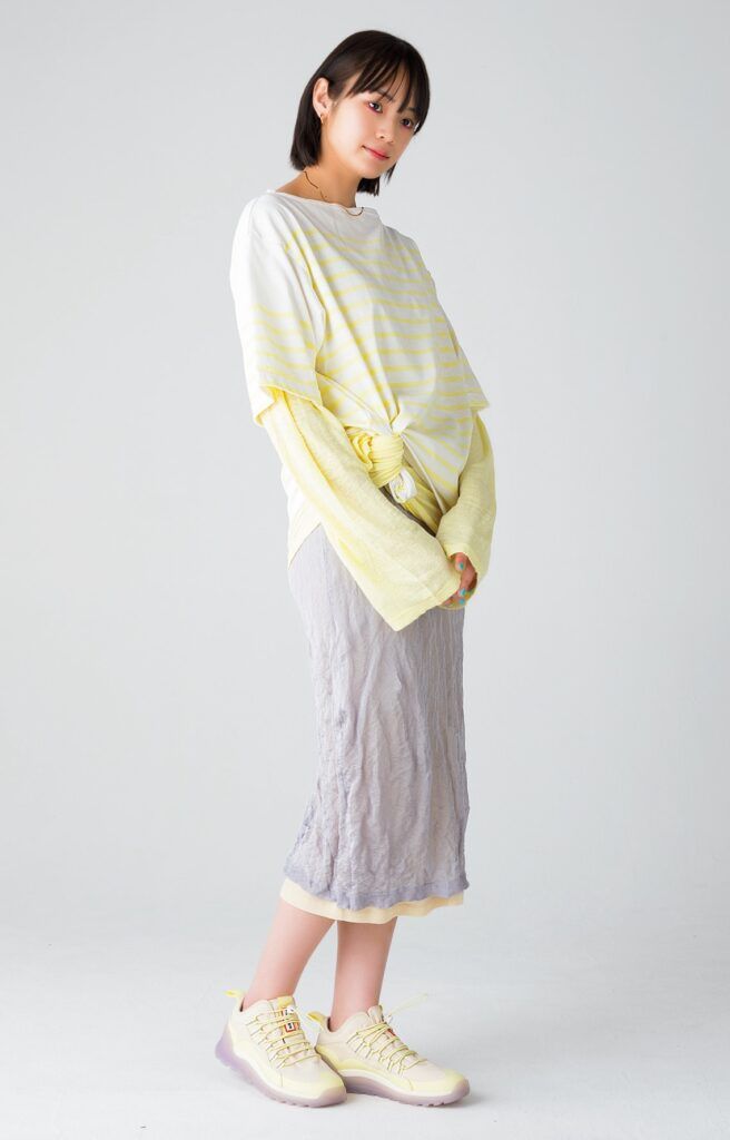 明るいイエローのボーダー柄が春らしさ満点。半袖T¥20,900 中に着たロンT¥28,600(共にウティ/にしのや TEL:03・6434・0983) スカート¥41,800(カレンテージ/メルローズ TEL:03・6682・0054) スニーカー¥27,500(ハンター/ハンタージャパン カスタマーサービス TEL:0120・563・567)