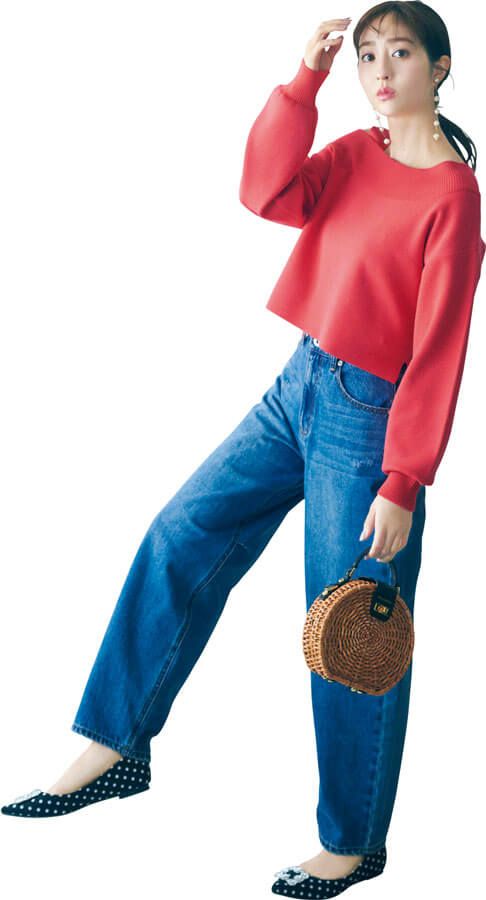 デニムパンツ¥17,600/アプワイザー・リッシェ ニット¥8,910/31 Sons de mode(ヒロタ) バッグ¥25,300/ヴィオラドーロ(ピーチ) イヤリング¥4,950/MEX(ロードス) パンプス¥3,490/神戸レタス