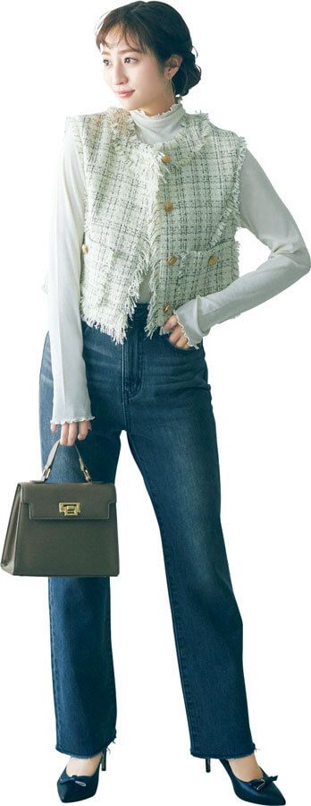 膝から裾にかけてほんのり広がるブーツカットデニムは、太ももまわりがタイトすぎないので着やせ効果も期待。レトロなツイードジレを合わせれば、小粋な上品スタイルもお任せ。
