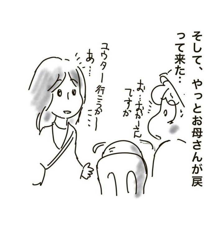 ゆらりゆうらさんは、男の子のそばについて様子をみていました。しばらくして母親らしき人が戻ってきます。やはり、子どもが「降りない」とだだをこねたため、その場を離れていたようです。