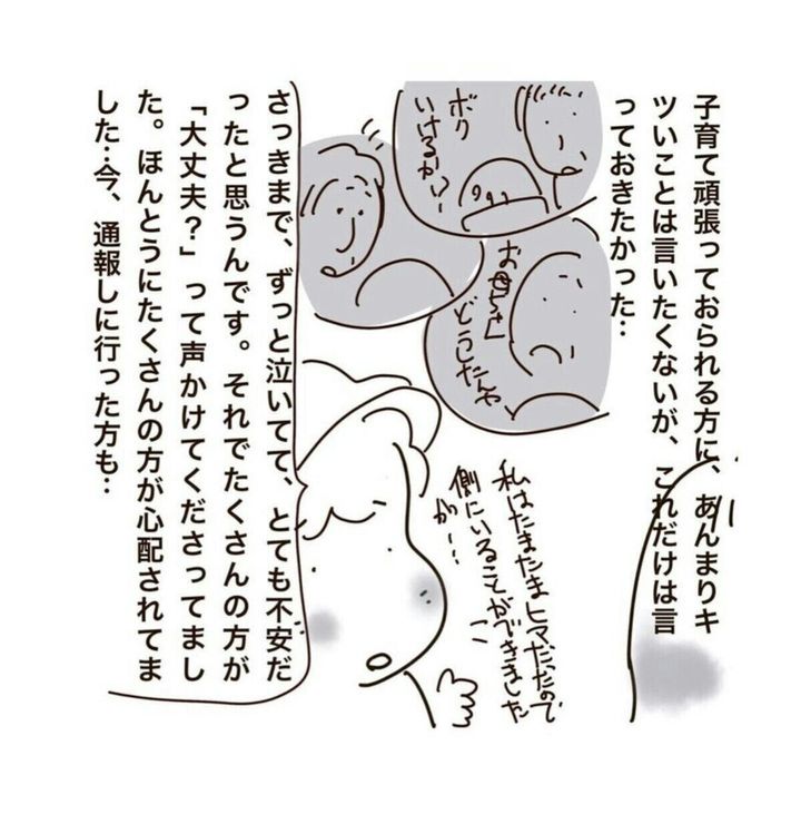 しかし、もしこのまま子どもが暴れて自転車ごと倒れてしまったら…。大けがを負ってしまいます。このあと著者とは別の方がやってきて「虐待として通報する」と警察を呼ぶことになりました。子どもを置き去りにする行為は子どもを危険にさらす虐待にあたり、このように通報・通告されてしまうことも考えられます。