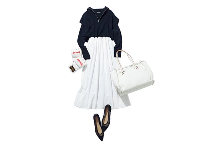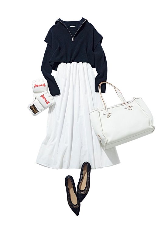 ジップニット付きワンピース(セット販売)¥18,700/ノエラ、トートバッグ¥69,300/ジャンニ キアリーニ(ジャンニ キアリーニ 銀座店)、チュールパンプス¥2,290/GU、グローブ/編集部私物