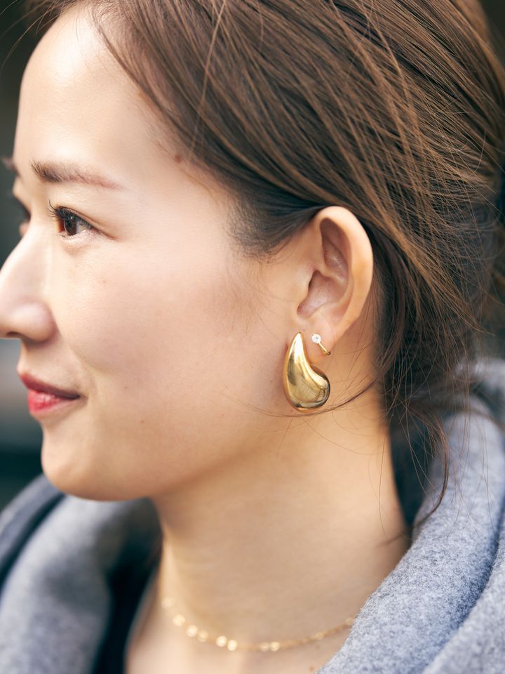 「直毛なので全体を緩く巻いてから、付けすぎない程度にガシガシとトラックオイルのNo.2をしっかり揉み込んでから結んでいます。お団子からはみ出る毛やおくれ毛は、スティックワックスを。今日はボリュームのあるパーカーだったので、存在感のあるアクセサリーも合わせて顔まわりが寂しくならないようにバランスをとりました」田部郁実さん/フリーランスPR(8歳女の子・10歳男の子ママ)