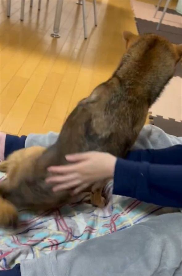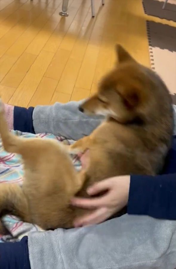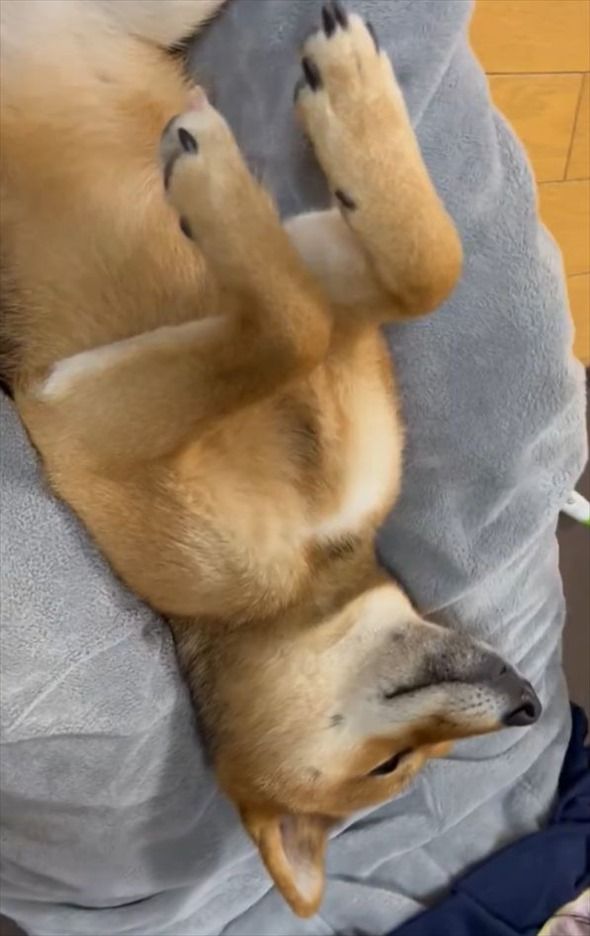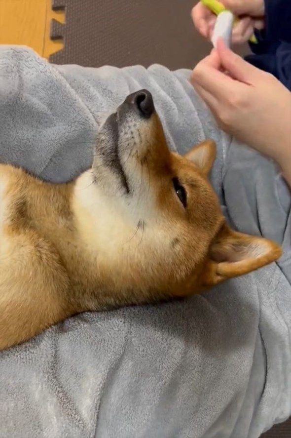 3. ごろんと寝転がり歯磨きしてもらえるのを待つ柴犬がかわいすぎる!「お利口ですね」「目を閉じて待ってるんですね」