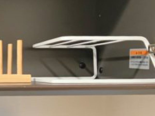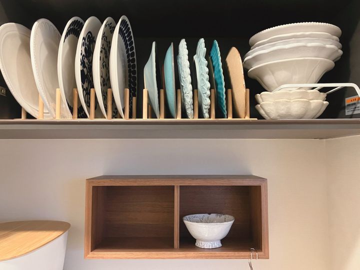 わが家では、このアイテムを吊り戸棚の中で2つ並べて使っています。大きい皿を立てて収納してもビクともせず、頼りになるアイテムです。