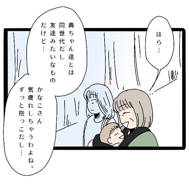 かなこさんがずっとアオちゃんの抱っこで疲れていることも、義父母とずっと一緒で気疲れしていることも、伯母はわかってくれていました。