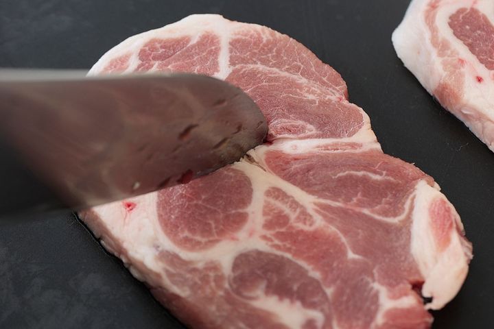 2.豚肉は赤身と脂身の境目に切り目を入れて筋を切る。