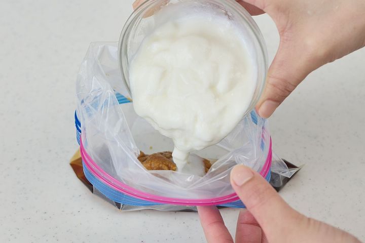 今回は保存袋を使いましたが、皿や保存容器で漬けてもOKです。その場合は肉をヨーグルトみそでまんべんなくおおうようにして、上からぴったりラップをするといいですよ。