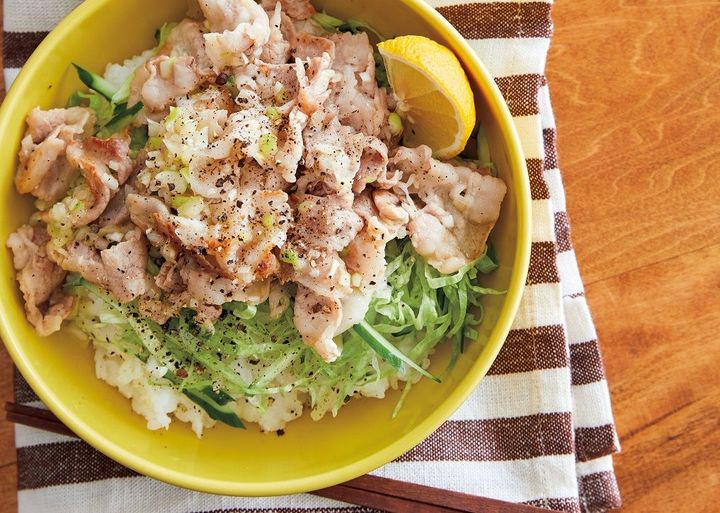 ということで、パンチのきいたねぎ塩味に、ご飯がとまらなくなる〈せん切り野菜のねぎ塩豚丼〉をご紹介。レタスやきゅうりをたっぷりのせて、丼ものにありがちな野菜不足もカバー。