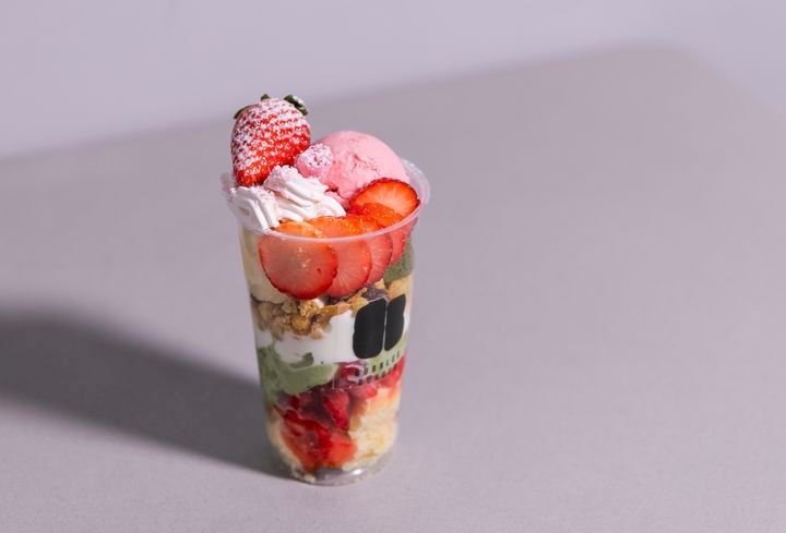 「たっぷり苺の桜パフェ」は、「苺・桜・抹茶」を一度に楽しめる、見た目にも春を感じる季節限定パフェです。あまおうアイス、苺ソース、抹茶ブラウニー、抹茶パンナコッタ、桜フレーク、桜の花など、階層ごとに違った味をお楽しみですよ♪